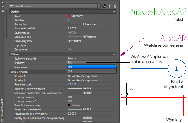 Do obiektów opisu należą wymiary, uwagi i innego typu symbole objaśniające bądź obiekty powszechnie używane do dodawania informacji do rysunku.