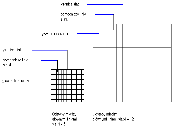Jeśli na przykład rysunek zostanie pomniejszony, gęstość wyświetlanych linii siatki ulegnie automatycznemu zmniejszeniu. Jeśli natomiast rysunek zostanie powiększony, pojawią się dodatkowe linie siatki w tej samej proporcji co główne linie siatki.