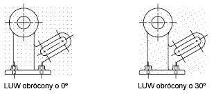 Aby rysować wzdłuż określonego kierunku lub kąta, można zmienić kąt siatki i skoku, obracając lokalny układ współrzędnych (LUW). Obrót ten ponownie wyrównuje krzyże nitkowe na ekranie, tak aby pasowały do nowego kąta. W poniższym przykładzie LUW zostaje obrócony o 30 stopni w celu dopasowania go do kąta kotwiczenia.