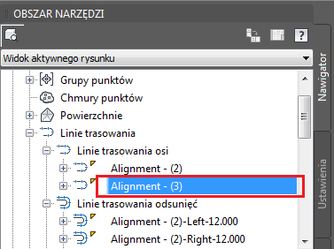 Linie trasowania osi jezdni w drzewie Nawigatora. To polecenie umożliwia szybkie znalezienie położenia przecinającej się linii trasowania w drzewie Nawigatora.