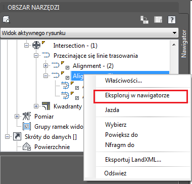 Innym elementem dostępnym w kolekcji Przecinające się linie trasowania jest polecenie Eksploruj w nawigatorze.
