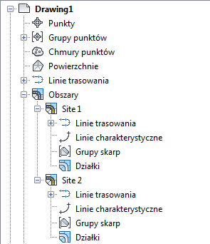 Każda kolekcja topologii obszaru zawiera kolekcje dla linii trasowania, profilowań i działek.