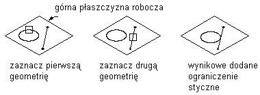 To wiązanie może być zdefiniowane między geometrią łuku (okręgiem lub łukiem) a inną geometrią łuku lub linią. Powoduje, że dwa łuki są do siebie styczne, nawet jeśli nie mają wspólnego punktu. Ograniczenie to jest zwykle stosowane do wymuszenia styczności linii z łukiem lub okręgiem.