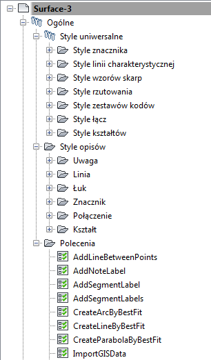 Obiekty Rury i Powierzchnia współużytkują te same style renderingu w grupie Style uniwersalne, natomiast Korytarze i Profilowanie współużytkują inne style z tego samego folderu.