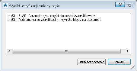 Jeśli w modelu występują błędy na pasku stanu pojawi się komunikat informujący o niepowodzeniu sprawdzania części i zostanie otwarte okno dialogowe z listą błędów. Należy zapoznać się z błędami, wprowadzić niezbędne modyfikacje i powtarzać czynności aż do uzyskania pomyślnego wyniku sprawdzania.