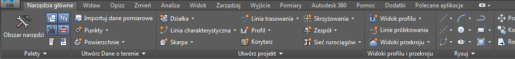 Wstążka programu AutoCAD Civil 3D to główny element interfejsu użytkownika umożliwiający korzystanie z poleceń i funkcji.