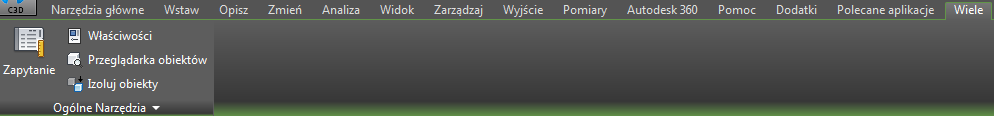 Jeśli wybranych zostanie wiele typów obiektów jednocześnie, na wstążce wyświetlona zostanie karta kontekstowa Wiele. Tak się stanie, jeśli na przykład wybrane zostaną jednocześnie obiekty sieci rurociągów i linii trasowania.