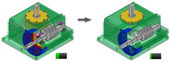 Uwaga: Jeśli część zastąpienia nie jest utworzona w tym samym położeniu i kierunku XYZ co zespół, to jest wstawiana do zespołu w innym położeniu niż zespół, który zastępuje. Użyj narzędzi Lokalizacja przez uchwyt lub przyłóż wiązania do pierwotnych elementów konstrukcyjnych, aby ponownie ustalić położenie części. Można uniknąć tej dodatkowej pracy, jeśli część zastąpienia zostanie utworzona z rzutowanych krawędzi lub szkiców na podstawie szczegółowego zespołu lub jeśli zostanie utworzona w oparciu o powierzchnie i bryły skopiowane ze szczegółowego zespołu.