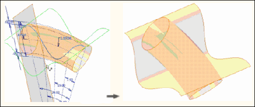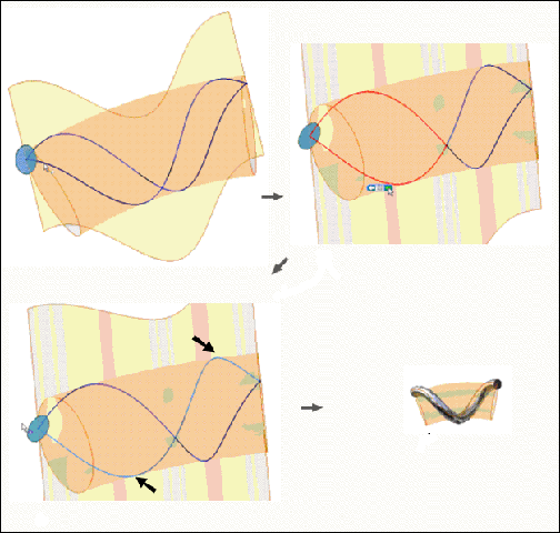- Wyciągnij szkic splajnu w obu kierunkach, tak aby przecinał sprężynę w obu kierunkach. Określ Wynik powierzchni, aby wygenerować wyciągniętą powierzchnię przecinającą się z obróconą powierzchnią.