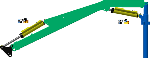 Niektóre komponenty zespołu muszą mieć możliwość przemieszczania się w inne położenia w zespole wyższego poziomu. Na przykład cylinder hydrauliczny może być używany kilkakrotnie w tym samym zespole i musi istnieć możliwość swobodnego jego przesuwania, aby przedstawić kinematyczny ruch zespołu. Za pomocą opcji Elastyczny można udostępnić dopuszczalny ruch zdefiniowany w podzespole w zespole macierzystym. Aby zrealizować to zachowanie, nie należy wiązać komponentu w pełni. Zamiast tego należy zdefiniować w zespole komponentu zależności, które zachowają wymagany ruch.