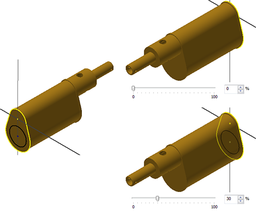 Ustawienie Nieprzezroczystość szkicu wyświetlana za pomocą modelu cieniowanego steruje stopniem, do którego geometria szkicu jest widoczna przez cieniowaną geometrię modelu. Domyślnym ustawieniem jest wartość 0%, które sprawia, że geometria szkicu jest całkowicie zasłonięta przez cieniowaną geometrię modelu. Należy zmienić wartość, aby włączyć przenikanie geometrii szkicu przez cieniowaną geometrię.