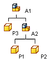 W tym przykładzie zespół A1 zapamiętuje połączenia do części P3 i podzespołu A2. Zespół A2 zapamiętuje połączenia do części P1 i P2. |