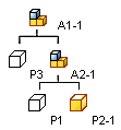 W tym przykładzie część P2 jest kopiowana, a nowy plik otrzymuje nazwę P2-1. Menedżer programu Design Assistant aktualizuje łącze podzespołu A2, tak aby odnosiło się do pliku P2-1. Podzespół nie odnosi się już w tym momencie do pliku oryginalnego. |