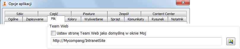 Zaznacz pole wyboru, aby zastąpić ekran początkowy narzędzi głównych programu Inventor określoną stroną Team Web.