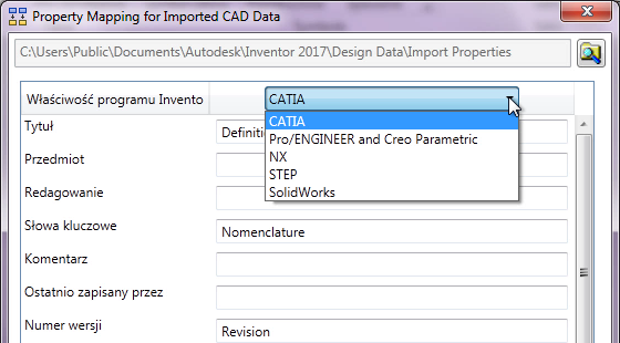- W oknie Odwzorowanie właściwości dla importowanych danych CAD kliknij menu rozwijane i wybierz format, na który chcesz odwzorować standardowe właściwości programu Inventor. Po uruchomieniu narzędzia do odwzorowania właściwości format w oknie dialogowym Importuj zostanie automatycznie dostosowany do formatu importowanego pliku.