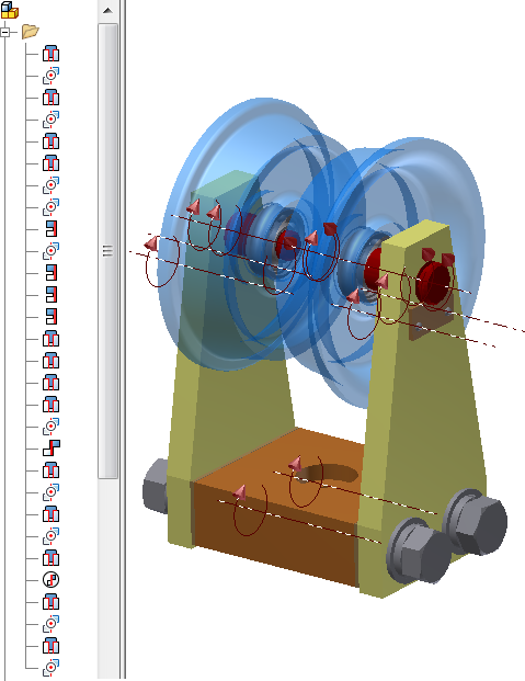Na poniższym obrazie dwa typy połączeń zespołu: Sztywne i Obrotowe służą do lokalizowania komponentów i definiowania stopni swobody. Ponieważ polecenie Połączenie jednoznacznie definiuje położenie komponentu i stopnie swobody, spójne i przewidywalne wyniki wymagają mniejszej liczby połączeń. Należy pamiętać, że opcja Sztywne jest najczęstszym typem połączenia, w przypadku którego obracają się tylko dwa łożyska. Oznacza to, że ruch zespołu wszystkich komponentów jest zdefiniowany prawidłowo. Połączeń można używać wraz z wiązaniami w celu uzyskania żądanych wyników.