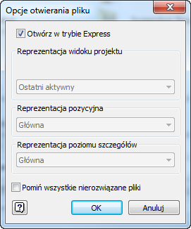 Niektóre polecenia są niedostępne w trybie Express, dlatego można ustawić domyślne zachowanie otwierania pliku na podstawie unikatowej wartości progu. Pozwala to na otwieranie bardzo dużych zespołów w trybie Express, a mniejszych lub mniej złożonych zespołów w trybie pełnym.