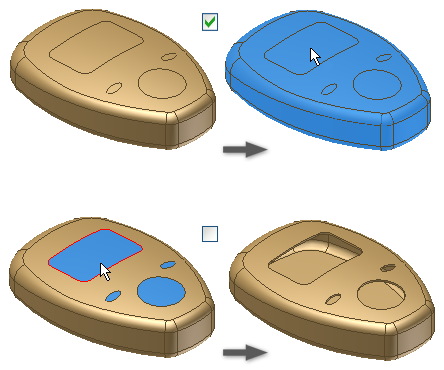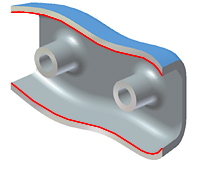 Za pomocą selektora Usuń powierzchnie na karcie Skorupa okna dialogowego Skorupa wybierz powierzchnie, które chcesz usunąć w oknie graficznym. Powierzchnie części, które nie zostały wybrane do usunięcia, stają się ścianami skorupy.