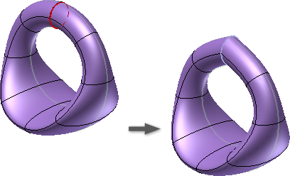 Przykładowo podczas tworzenia pokrywki dzbanka na kawę obwiednia pokrywki musi być dopasowana do obwiedni dzbanka. W pierwszej kolejności należy użyć różnych poleceń kształtu swobodnego, aby utworzyć przybliżony kształt pokrywki. Następnie, korzystając z polecenia Dopasuj krawędź, należy dopasować krawędź bryły swobodnej pokrywki do krzywych obwiedni modelu dzbanka na kawę.