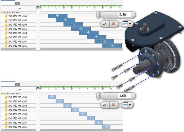 Wybierz co najmniej jeden komponent, a następnie uaktywnij polecenie rozsunięcia. Układ rozsunięcia zostanie wyświetlony na komponencie wybranym jako pierwszy. To położenie można zmienić. Jeśli w tym samym czasie rozsuwanych jest wiele komponentów, jest to określane jako grupa rozsunięcia. Komponenty nie są pogrupowane na osi czasu.