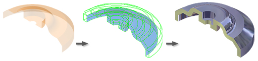 W przypadku odsunięcia można użyć powierzchni utworzonych w programie Autodesk Inventor lub powierzchni zaimportowanych. Importowane powierzchnie należy podwyższyć do środowiska części. Operacji pogrubiania lub odsunięcia nie można wykonać w środowisku konstrukcyjnym.
