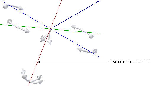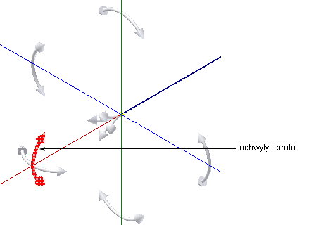 Aby użyć funkcji Uchwyty obracania, kliknij strzałkę wskazującą potrzebną pozycję kątową, a następnie przeciągnij ją do wymaganej pozycji. Zatrzask zostanie wykonany w regularnych odstępach na podstawie wartości Zatrzasku kątowego 3D. Wartość jest ustalana na karcie Narzędzia