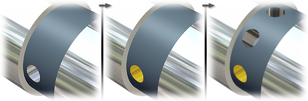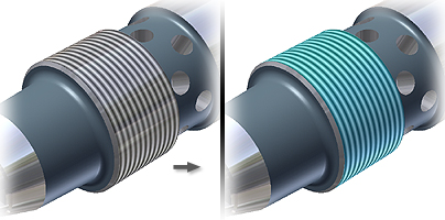 Jeśli zespół (niedostępny w programie Inventor LT) zawiera wielokrotne wystąpienia części, wszystkie wystąpienia są uaktualniane o nowy wygląd powierzchni. Na tej ilustracji wygląd powierzchni został zmieniony na Złoty metaliczny. Każde wystąpienie tej części jest uaktualniane o nowy wygląd powierzchni.