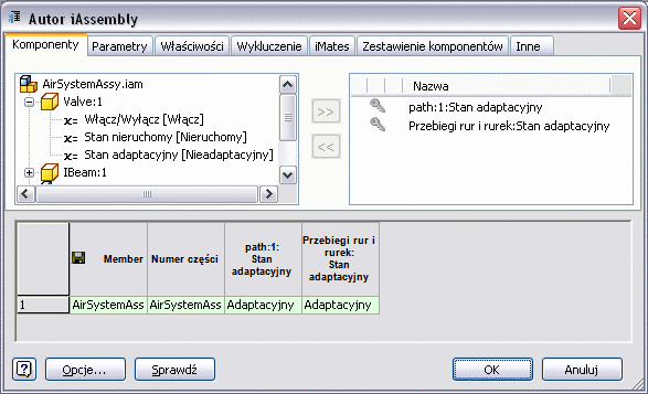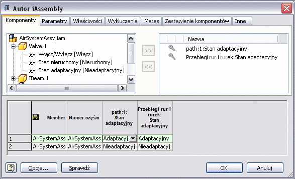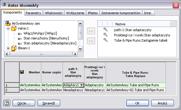 Redagowanie iPart/iAssembly. Nazwa pliku głównego zespołu przebiegów jest wyświetlana na liście obiektów kandydatów, domyślnie: Przebiegi przewodów rurowych. Stan adaptacji zostaje automatycznie wybrany do tabeli konfiguracji.