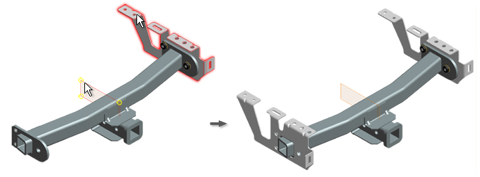 - Komponenty ponownie wykorzystywane są transformowane przez obrót i przesunięcie. Płaszczyzna symetrii jest obliczana automatycznie, a następnie przecięta z płaszczyzną lustrzaną, aby określić oś wzdłuż której następuje obrót. Rezultat przypomina transformację lustrzaną, ale w istocie jest obrotem i przesunięciem.