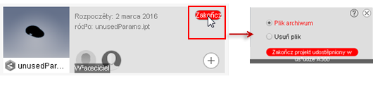 - Zakończenie udostępniania projektu: Kliknij ikonę Koniec dostępną w prawym górnym rogu. Następnie można wybrać opcję archiwizacji lub usunięcia projektu udostępnionego.