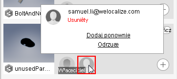 Jeśli po usunięciu współpracownika nie kliknięto przycisku Odrzuć, aby usunąć miniaturę współpracownika, zostaje ona widoczna ale niedostępna. Ponowne dodanie współpracownika: Umieść kursor na widocznej-niedostępnej miniaturze i wybierz polecenie Dodaj ponownie. Ponownie dodany współpracownik otrzyma wiadomość e-mail z zaproszeniem do udziału w projekcie udostępnionym.