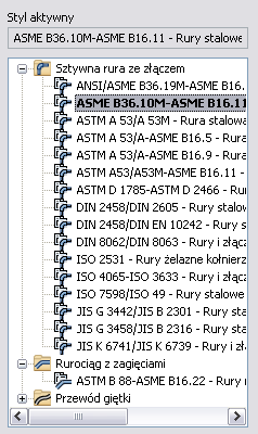 Po pierwszym otwarciu okna dialogowego Style przewodów rurowych w przeglądarce automatycznie rozwijany jest węzeł aktywnego stylu. Wyświetlany aktywny styl jest zależny od bieżącego środowiska przewodów rurowych. Aktywny styl jest wyświetlany ponad przeglądarką stylów w polu wprowadzania „tylko do odczytu”. Ten styl w przeglądarce jest wyświetlany pogrubioną czcionką.
