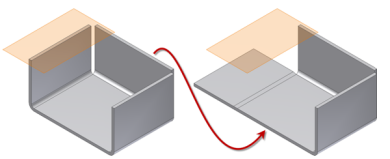 Po lewej stronie płaszczyzna konstrukcyjna została utworzona za pomocą elementów modelu zagiętego. Po prawej stronie widać, że płaszczyzna konstrukcyjna pozostaje na miejscu, gdy element macierzysty zostaje rozwinięty.