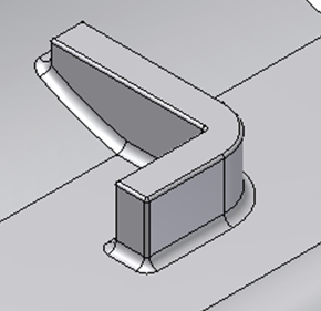 Przykład: Posiadasz element taki sam, jak na poniższej ilustracji (wyciągnięcie proste płaskiego profilu Do następnej). Krawędzie elementu należy zaokrąglić samodzielnie. Wszystkie krawędzie na przecięciu pomiędzy elementem i cienką ścianą części.