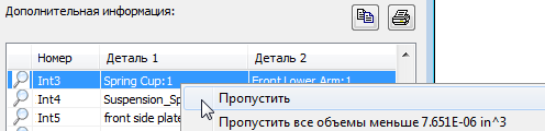 Kliknąć prawym przyciskiem myszy element i zaznaczyć go, aby zignorować wybraną objętość, lub zignorować wszystkie kolizje o objętości mniejszej niż wybrana wartość.