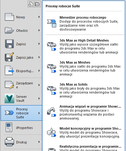 Proces roboczy Suite to mechanizm służący do eksportowania opracowanego projektu ze źródłowego produktu Autodesk do produktu docelowego w celu przeprowadzenia szczegółowego renderowania lub animacji. Ustawienia w procesie roboczym powodują automatyczne przekształcenie obiektów projektu do prezentacji w programie 3ds Max lub Showcase. Przykładowo: proces roboczy obejmujący renderowanie zewnętrzne w programie 3ds Max renderuje zewnętrzne powierzchnie projektu budynku, w tym światła i cienie. Proces roboczy animacji więzów w programie Showcase przedstawia zespół mechaniczny w ruchu, przekształcając wiązania zakresu w animowane zachowania. Procesów roboczych można używać do przygotowywania podglądu projektów i tworzenia sugestywnych prezentacji.