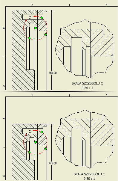 Polecenia Dołącz wiąże definicje szczegółów z widokiem macierzystym w środowisku rysunku. Jeśli wymiary lub zależności pozycyjne geometrii rzutu macierzystego zostaną zmienione, to dołączona definicja szczegółu pozostaje dołączona i przesuwa się z określonym przez użytkownika wierzchołkiem dołączenia.