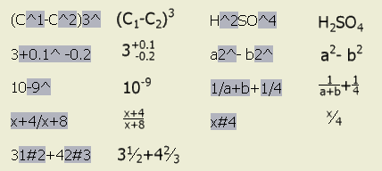Przykład prawidłowego formatu umieszczania piętrowego: Lewa kolumna zawiera tekst w oknie dialogowym Formatowanie tekstu. Ciągi, które mają być umieszczone piętrowo są wyróżnione kolorem szarym. Prawa kolumna zawiera końcowy wygląd tekstu na rysunku (po zastosowaniu umieszczania piętrowego). ![]() |