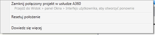Kliknij prawym przyciskiem myszy przycisk wprowadzania Połączony projekt i wybierz polecenie Zamknij połączony projekt w usłudze A360.