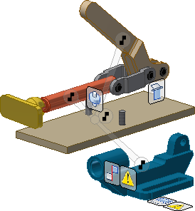 Użyj polecenia Ruch swobodny, aby przeciągać pojedyncze komponenty w dowolnym liniowym kierunku w płaszczyźnie widoku. Polecenie Ruch swobodny wyświetla zależności pomiędzy komponentami jako taśmę elastyczną. Zostaną wyświetlone znaczniki wskazujące typ zależności. Znacznik błędu zostanie wyświetlony w przypadku, gdy istnieją konflikty zależności.