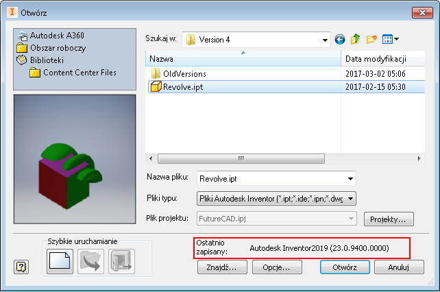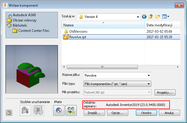 - Odszukaj i wybierz przyszły plik części (.ipt) do umieszczenia. Zostanie wyświetlona wersja programu Inventor, w której plik został ostatnio zapisany.