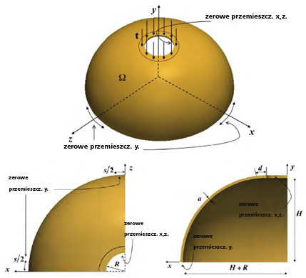 Ten problem polega na analizie cienkiej, półkulistej skorupy. Skorupa ma otwór na górze, wokół którego zastosowane jest obciążenie naciskiem. Przemieszczenia w osi y są zablokowane na dolnej krawędzi półkuli. Przemieszczenia na osi x i z są zablokowane wokół otworu w górnej części półkuli [2].
