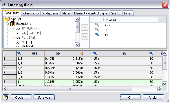 Na przykład: gdy otwarta zostanie przykładowa część iPart Autodesk\Inventor Professional <wersja>\Tutorial Files\Tube & Pipe\Example_iparts\pipe.ipt. W przeglądarce Model kliknij dwukrotnie Tabela i otwórz okno dialogowe Redagowanie iPart: