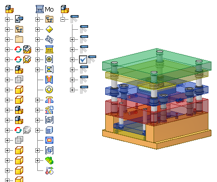 Zakończ asocjacyjność: Program Mold Design zapewnia zakończenie asocjacyjności w całym procesie projektowania formy. Projekty form można zmieniać dowolnie. Zmiany wykonane dla części formowalnej są automatycznie propagowane dla matrycy i stempla. Wszelkie zmiany kanałów chłodzenia, płyt lub komponentów standardowych znajdują automatyczne odzwierciedlenie w bazie formy.