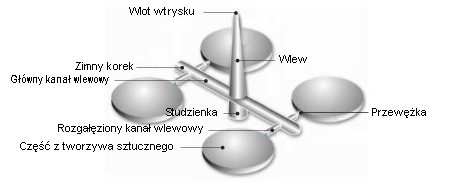 System kanału wlewowego obejmuje główny (podstawowy) kanał wlewowy, rozgałęzienie kanału wlewowego (drugorzędowy kanał wlewowy) i trzeciorzędowy kanał wlewowy.