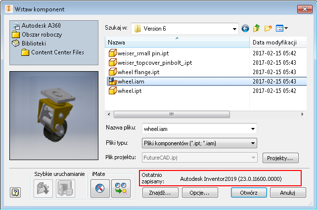 Można tworzyć odniesienia do przyszłych (nowszych) wersji plików zespołu programu Inventor w starszej wersji programu Inventor.