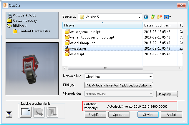 - Plik można zapisać i ponownie otworzyć w dowolnej instalacji programu Inventor o tej samej wersji.