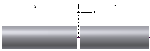 W przypadku przerw pomiędzy segmentami rur przerwa (1) jest wypośrodkowana na węźle i połowa odległości przerwy jest odejmowana od końca każdej rury (2).
