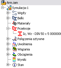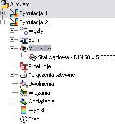 . Zespół zostanie automatycznie uproszczony do modelu obliczenia belki. Okno graficzne wyświetla belki, węzły i znacznik grawitacji. W folderze Stan są wyświetlane niewystarczające materiały belek i przekroje.