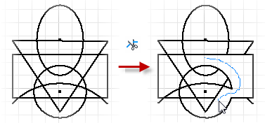 W środowisku szkicu 2D polecenie Utnij umożliwia ucięcie krzywej w miejscu najbliższego przecięcia z inną krzywą lub ucięcie wybranej geometrii w sposób zdefiniowany przez obwiednie geometrii. Operacja ucięcia powoduje utworzenie wiązania zgodności między punktem końcowym ucinanej krzywej a krzywymi obwiedni.